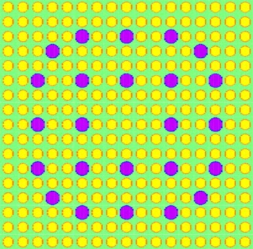 The EPR simulations presented in here are based on a single, homogeneous, core-equivalent assembly placed as an infinite lattice in the radial direction, but with axial leaks permitted. This assembly consists of 265 fuel pins of 0.475 cm outer radius with a M5 Zircaloy cladding of 0.57 mm thickness, and 24 guide tubes of radius 0.616 cm for insertion of control rods (see Figure 1). The fuel pins have homogeneous mixtures of UO2 and ThO2.