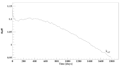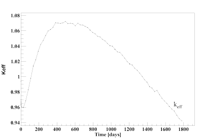 | Her forbrukes det hovedsakelig uran-235, men man ser tydelig at det produseres en god del uran-233 også (k-verdien starter å vokse etter ca 175 dager) |
